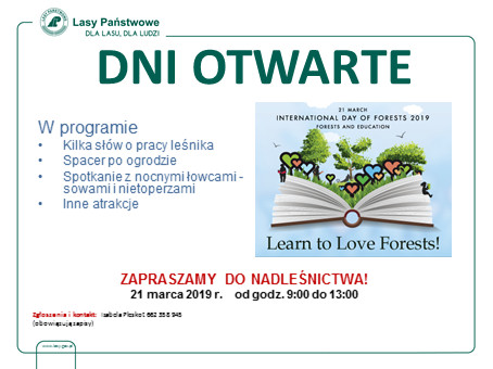 Dlatego nigdy nie jest zbyt wcześnie na edukację. Im młodsze dzieci uświadomią sobie znaczenie terenów leśnych, tym lepiej. Taka wiedza zostanie z nimi na dalszą część życia. Okazją do zdobycia nowych wiadomości będzie Międzynarodowy Dzień Lasów, ustanowiony przez Zgromadzenie Ogólne ONZ w 2012 roku. W ramach tego święta, 21 marca w Nadleśnictwie Wejherowo odbędzie się dzień otwarty.