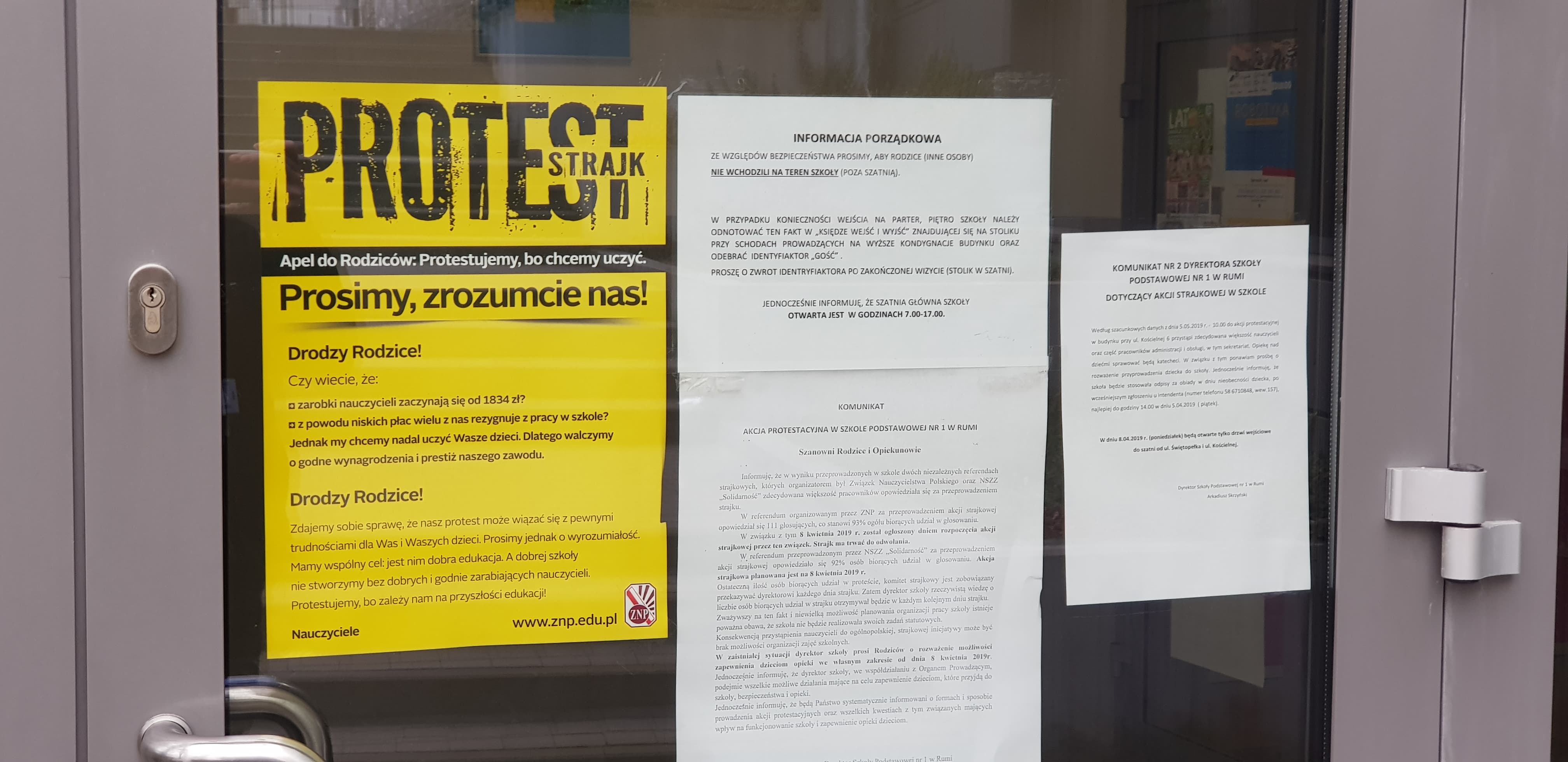 – Drodzy Rodzice! Zdajemy sobie sprawę, że nasz protest może się wiązać z pewnymi trudnościami dla Was i Waszych dzieci. Prosimy jednak o wyrozumiałość. Mamy wspólny cel: jest nim dobra edukacja. A dobrej szkoły nie stworzymy bez dobrych i godnie zarabiających nauczycieli. Protestujemy, bo zależy nam na przyszłości edukacji! – zwracają się nauczyciele z ZNP na plakatach, które powieszono przed szkołami.