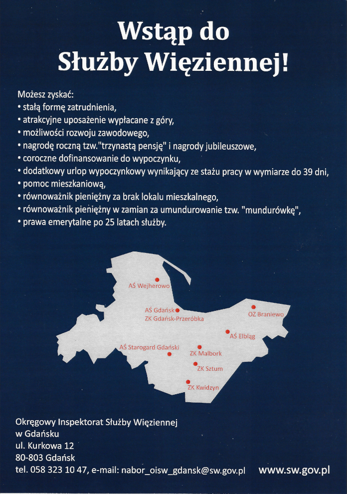 Szczegółowe informacje dotyczące postępowania kwalifikacyjnego można uzyskać pod adresem Okręgowego Inspektoratu Służby Więziennej w Gdańsku (ul. Kurkowa 12, 80–803 Gdańsk) i pod numerem telefonu 58 323 10 47 oraz adresem e-mail: nabor_oisw_gdansk@sw.gov.pl.