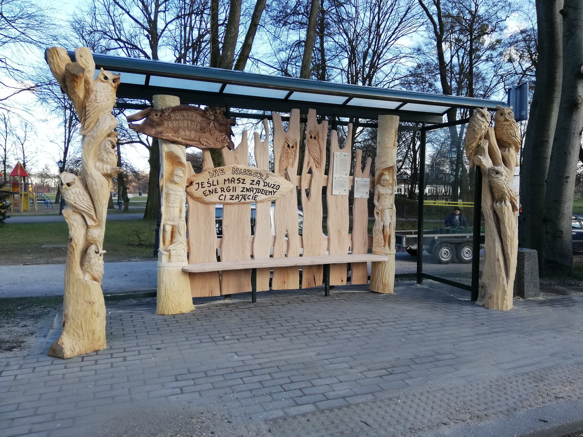 Drewniane, rzeźbione przystanki mają być zabezpieczeniem przed wandalami, są bardziej wytrzymałe na urazy.