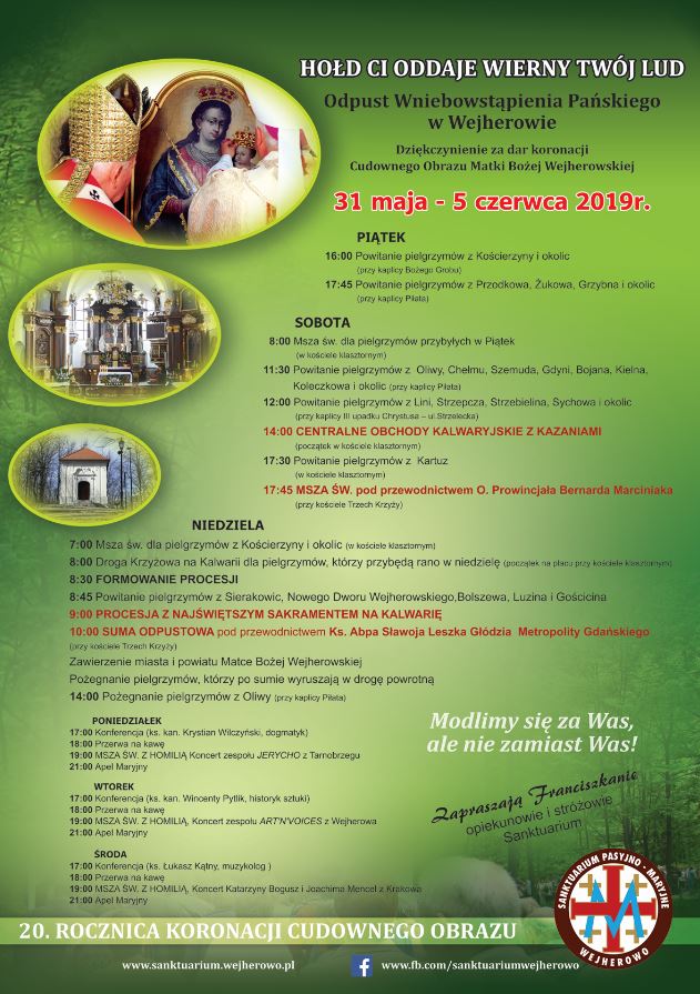Przy kościele Trzech Krzyży na Kalwarii Wejherowskiej odbędzie się uroczysta msza święta w intencji zawierzenia powiatu wejherowskiego Matce Bożej Wejherowskiej. Tysiące pielgrzymów z Pomorza i całej Polski co roku przybywa do Wejherowa na Odpust Wniebowstąpienia.