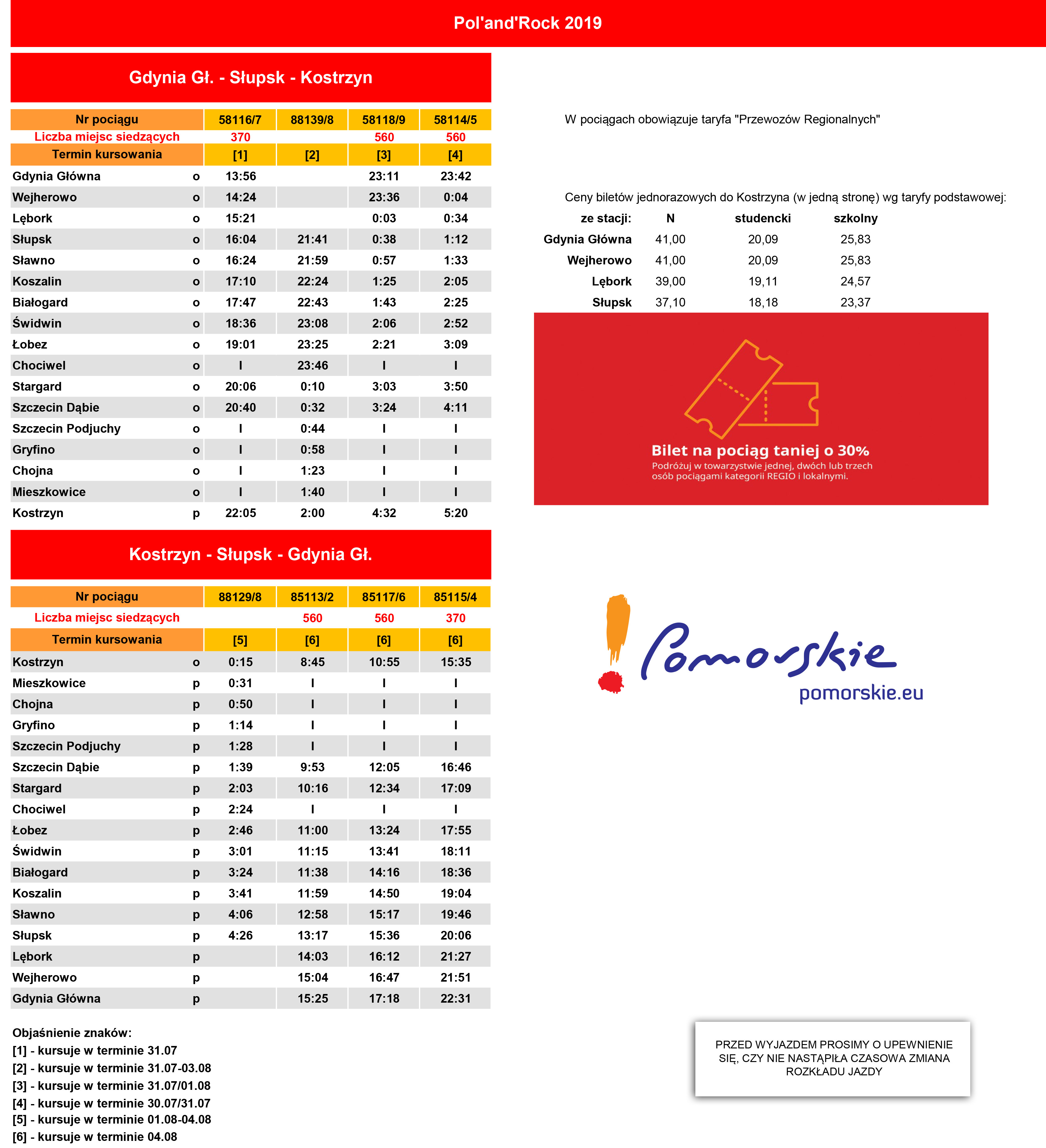 Władze województwa pomorskiego opublikowały rozkład jazdy specjalnych festiwalowych pociągów. Pierwszy z nich wyruszy z Gdyni Głównej we wtorek, 30 lipca o godz. 23:42 i ma dotrzeć do Kostrzyna następnego dnia o godz. 5:20. Dwa kolejne wyjadą na tory z Gdyni Głównej w środę, 31 lipca o godz. 13:56 oraz o godz. 23:11.