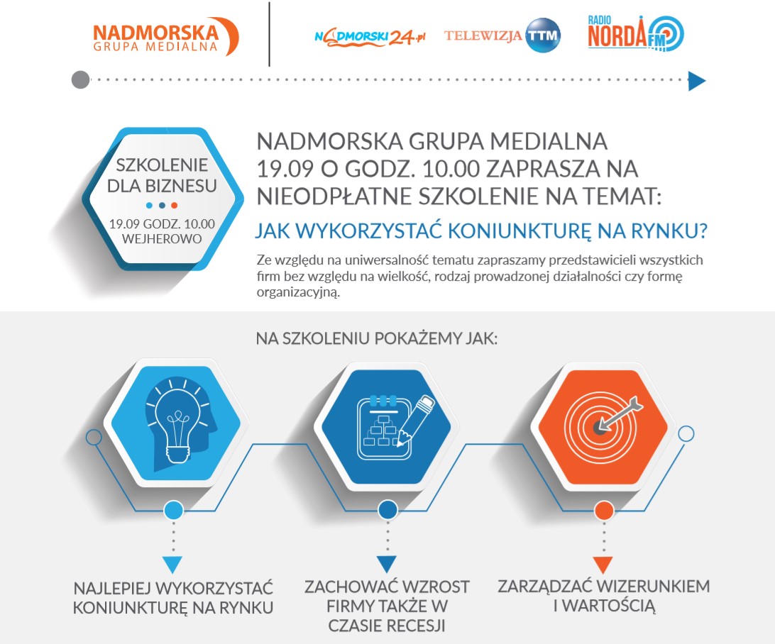 Co zrobić, by uniknąć „pułapek gospodarczych”? W jaki sposób działać, by pozyskać bardziej wartościowych klientów? Jak przygotować się do spowolnienia gospodarczego? Odpowiedzi m.in. na te pytania będzie można uzyskać 19 września w trakcie bezpłatnego szkolenia „Jak wykorzystać koniunkturę na rynku”, które odbędzie się w siedzibie Nadmorskiej Grupy Medialnej przy ulicy Przemysłowej 3 w Wejherowie. Udział w wydarzeniu jest bezpłatny.