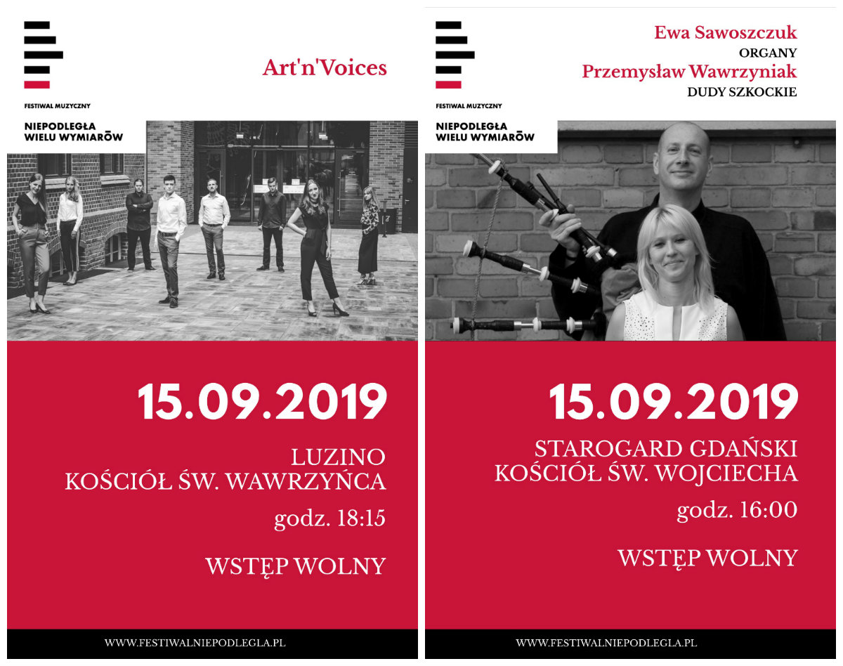 Festiwal Muzyczny „Niepodległa wielu wymiarów” to projekt kulturalny, na który składa się 11 wydarzeń artystycznych, realizowanych w 10 miejscowościach województwa pomorskiego. W najbliższą niedzielę (15 września) w ramach festiwalu odbędzie się koncert zespołu Art’n’Voices w Luzinie. W tym samym dniu w kościele pw. św. Wojciecha w Starogardzie Gdańskim wystąpi Ewa Sawoszczuk (organy) oraz Przemysław Wawrzyniak(dudy szkockie).