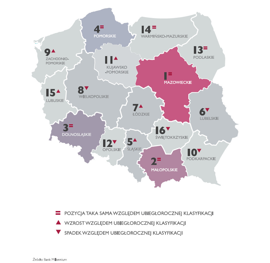 Analitycy badają wszystkie regiony i przygotują analizę w pięciu najbardziej wpływających na innowacyjność aspektach. Zalicza się do nich: wydajność pracy, wydatki na badania i rozwój, liczbę studentów, liczbę zatrudnionych w sektorze B+R oraz liczbę wydanych patentów. Polskimi liderami innowacyjności w „Rankingu Millenium” niezmiennie są cztery regiony. To województwa: mazowieckie, małopolskie, dolnośląskie i pomorskie. Wszystkich liderów łączy jedno – silnie rozwinięta przedsiębiorczość, wykształceni pracownicy i bardzo dobrze rozwinięta baza edukacyjna. Zastawienie zamykają województwa warmińsko-mazurskie, lubuskie i świętokrzyskie.
