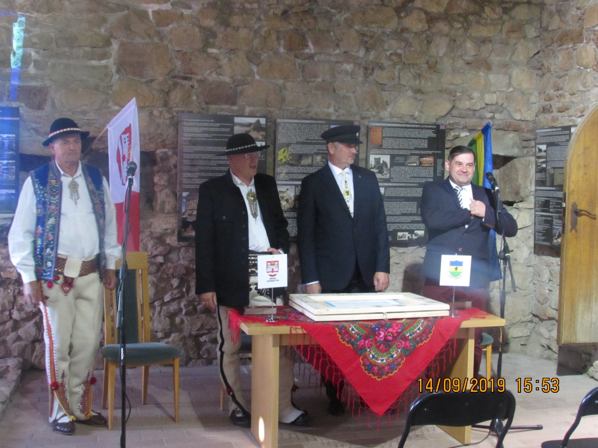 Włodarz zaprezentował obecnym na spotkaniu w zamku główne walory i atrakcje regionu oraz wyraził nadzieję, że dzień podpisania porozumienia będzie początkiem żywej i rozwijającej się współpracy. Następnie głos zabrał Adam Śliwicki, wójt gminy Krokowa, który – zdaniem samorządowców z partnerskiej gmin – posługując się tradycyjną gwarą, charakterystyczną dla naszego regionu, życzył obu gminom realizacji wspólnych celów i zamierzeń.