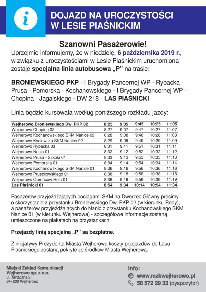 Przejazdy pasażerów autobusami MZK Wejherowo do Lasu Piaśnickiego są bezpłatne. Koszty przejazdów do „Lasu Piaśnickiego” pokryte zostaną ze środków Miasta Wejherowa.