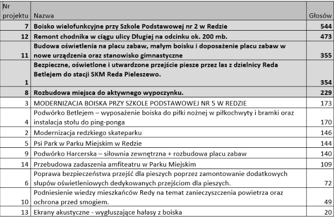W ubiegły piątek (27 września) ogłoszono wyniki Budżetu Obywatelskiego 2020 w Redzie. Wnioski, które płyną z rozkładu poszczególnych głosów, są jednoznaczne – mieszkańcy miasta wyrazili chęć, by większe środki przeznaczyć na modernizację i budowę infrastruktury. Największe poparcie zyskały zatem projekty odnoszące się do projektów infrastruktury sportowo-rekreacyjnej i drogowej.