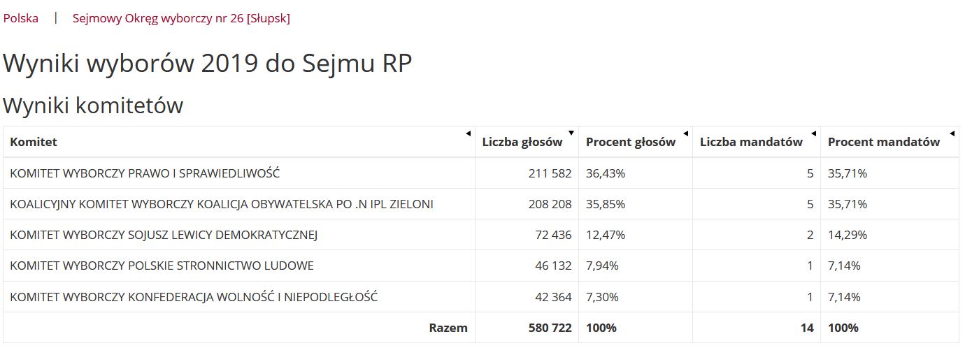 Ciekawie rozłożyły się głosy w Okręgu Wyborczym nr 26, do którego należały m.in. powiaty wejherowski i pucki. Dwie największe partie polityczne niemal zremisowały w regionie. PiS zdobyło o 3800 głosów więcej, ale udział mandatów jest taki sam – po pięć.