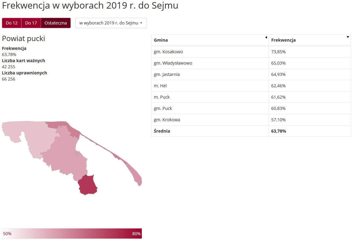 Nieco niższą frekwencję, 63,78, odnotowano w powiecie puckim. Tutaj jednak warto zwrócić uwagę na gminę Kosakowo, gdzie zagłosowało aż 73,85% osób.