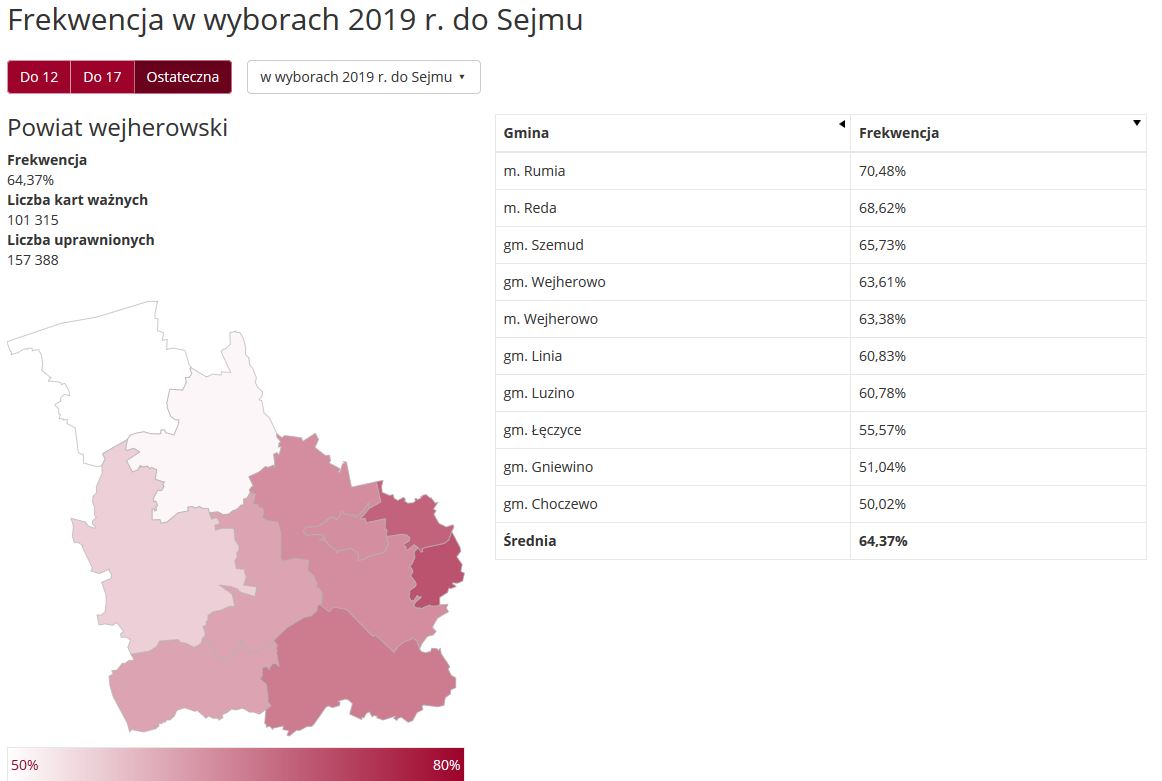 Spośród wszystkich powiatów województwa pomorskiego bardzo dobre, piąte miejsce zajął powiat wejherowski, gdzie odnotowano frekwencję na poziomie 64,37%. Tutaj szczególnie dobrze wypadła Rumia, gdzie do urn poszło 70,48% uprawnionych.