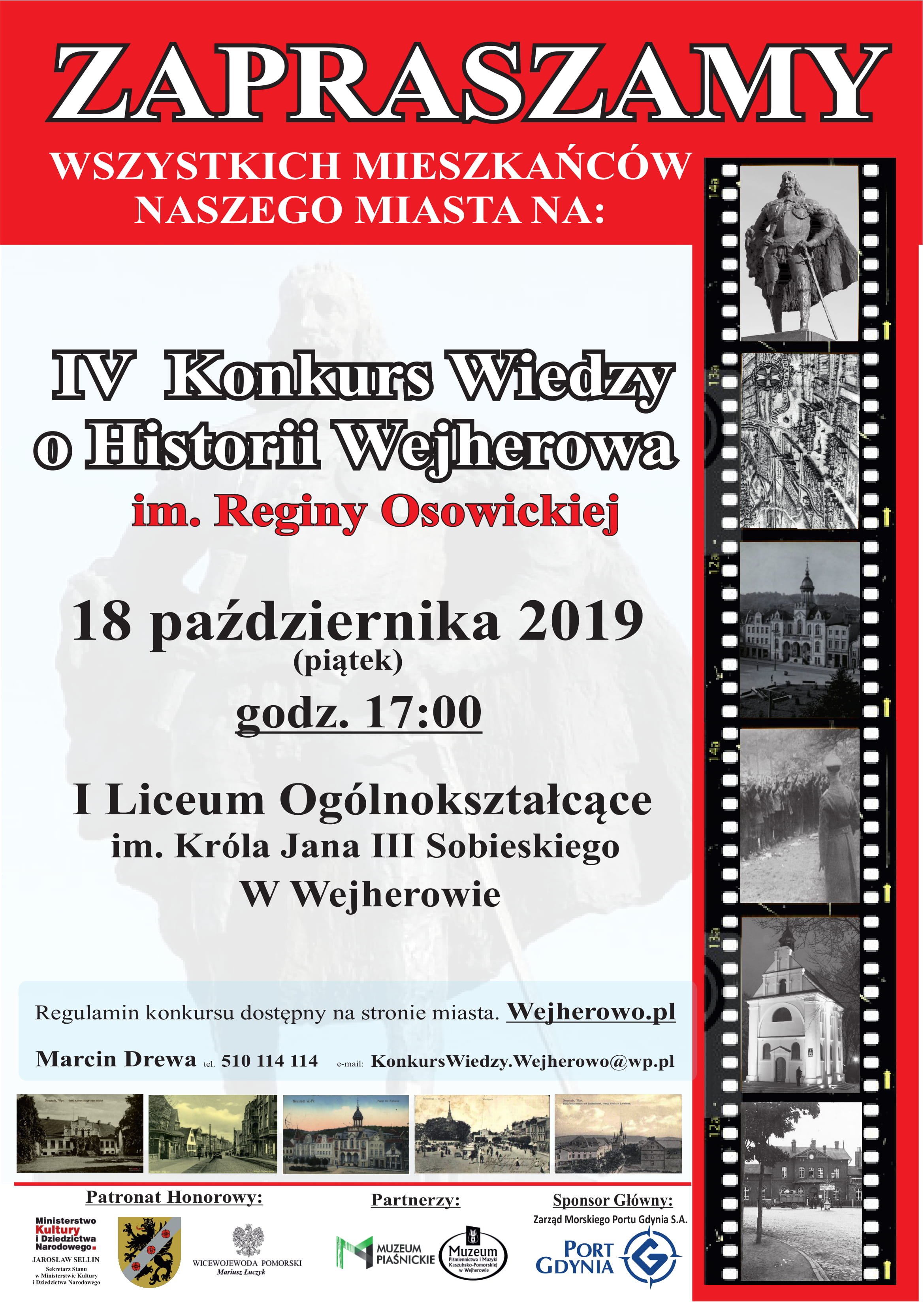 Wszyscy mieszkańcy Wejherowa i sympatycy tego miasta już w najbliższy piątek (18 października) będą mogli sprawdzić swoją wiedzę na temat stolicy powiatu wejherowskiego. Okazją ku temu będzie IV edycja Konkursu Wiedzy o Historii Wejherowa im. Reginy Osowickiej. Konkurs odbędzie się pod honorowym patronatem Ministerstwa Kultury i Dziedzictwa Narodowego, Starostwa Powiatowego w Wejherowie i wojewody pomorskiego.