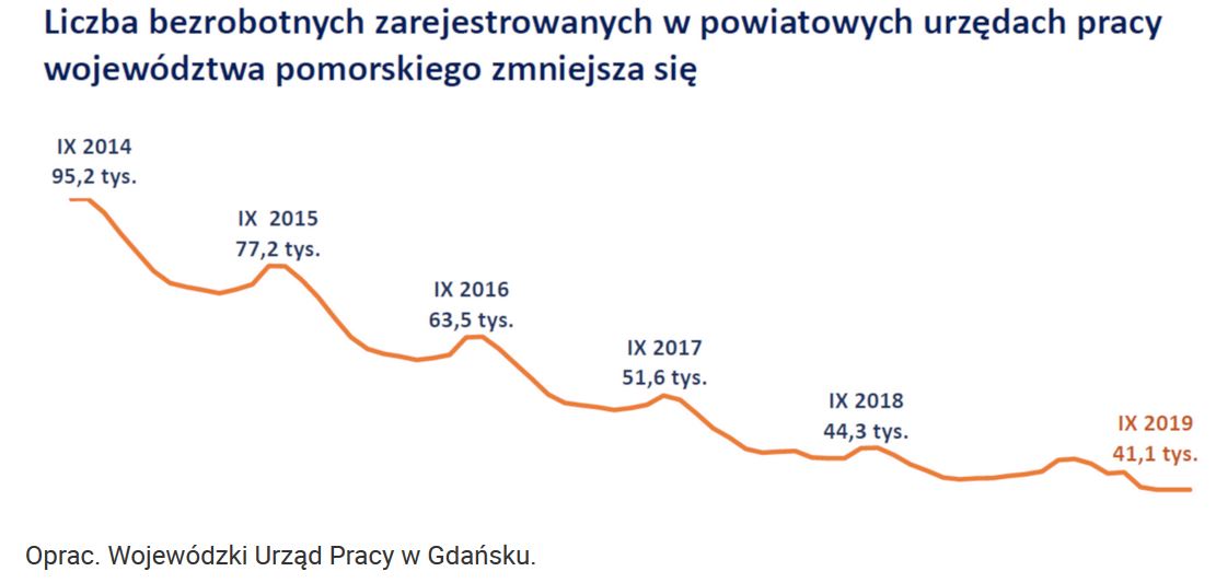Warto zwrócić uwagę na przedsiębiorczość mieszkańców Pomorza. Do września 2019 roku w naszym regionie działało 306 tys. firm, a liczba ta zwiększyła się w stosunku do ubiegłego roku o około 10 tys. Pięć lat temu na Pomorzu funkcjonowało niespełna 276 tys. podmiotów gospodarczych. Pod względem przedsiębiorczości Pomorze ustępuje tylko Mazowszu. W ciągu minionych pięciu lat liczba zarejestrowanych bezrobotnych spadła o ponad połowę – z 95,2 tys. we wrześniu 2014 roku do 41,1 tys. w tym samym miesiącu 2019 roku.