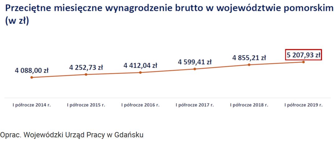 Rynek pracownika sprawia, że pracodawcy są skłonni oferować wyższe, konkurencyjne wynagrodzenia. Przeciętne wynagrodzenie na Pomorzu w pierwszym półroczu 2019 roku wynosiło 5207,93 złotych brutto, co daje Pomorskiemu trzecie miejsce w Polsce. W ciągu minionych pięciu lat średnia płaca brutto wzrosła o prawie 1120 złotych.