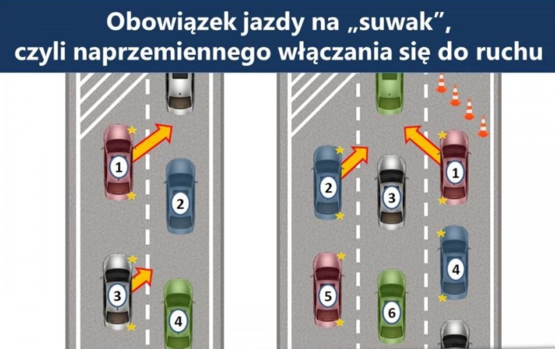 Z kolei jazda „na suwak” może przyczynić się do upłynnienia ruchu, z wykorzystaniem istniejącej infrastruktury. Kierowca, który znajduje się na pasie pobocznym, powinien dojechać do jego końca, nie wcześniej, a następnie oczekiwać, aż zostanie wpuszczony na główny pas ruchu. Natomiast poruszający się główny pasem mają obowiązek wpuszczenia jednego pojazdu z pasa pobocznego.