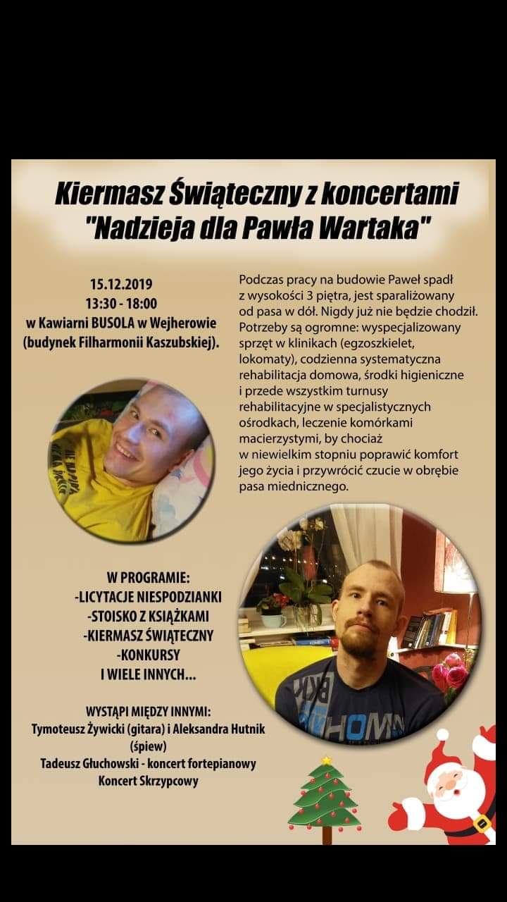 Paweł ma 28 lat i mieszka w Wejherowie. Podczas pracy na budowie spadł z wysokości III piętra. Połamał sobie kręgi i przerwał rdzeń kręgowy. Jest sparaliżowany od pasa w dół. Rodzina i bliscy Pawła postanowili mu pomóc, urządzając kiermasz świąteczny z koncertami. W trakcie wydarzenia odbędzie się zbiórka pieniędzy, która zostanie przeznaczona na leczenie wejherowianina.