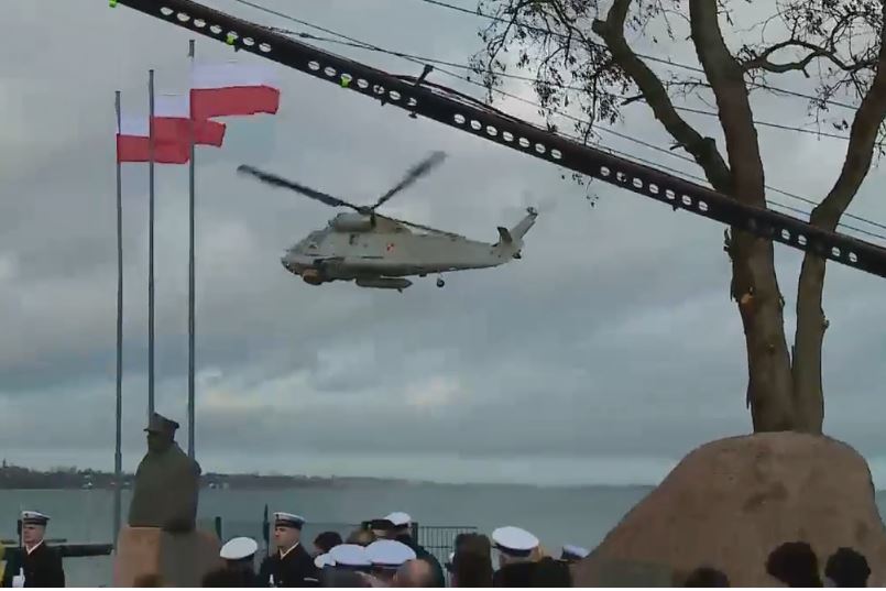Śmigłowiec Marynarki Wojennej złożył symboliczną wiązankę kwiatów na wodach Zatoki Puckiej.