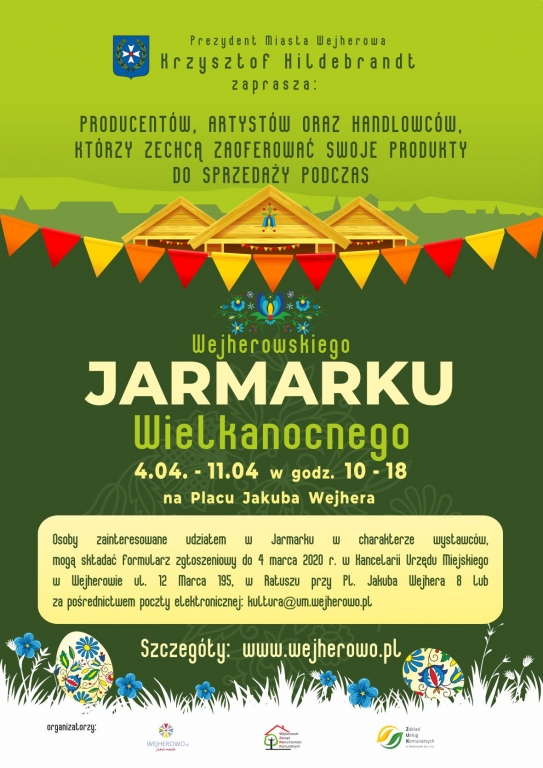 – Osoby zainteresowane udziałem w Jarmarku Wielkanocnym, w charakterze wystawców mogą składać formularz zgłoszeniowy do 4 marca 2020 r., do godz. 15:30 w Kancelarii Urzędu Miejskiego w Wejherowie, ul. 12 Marca 195, lub w Ratuszu przy pl. Jakuba Wejhera 8 – czytamy na stronie Wejherowo.pl.