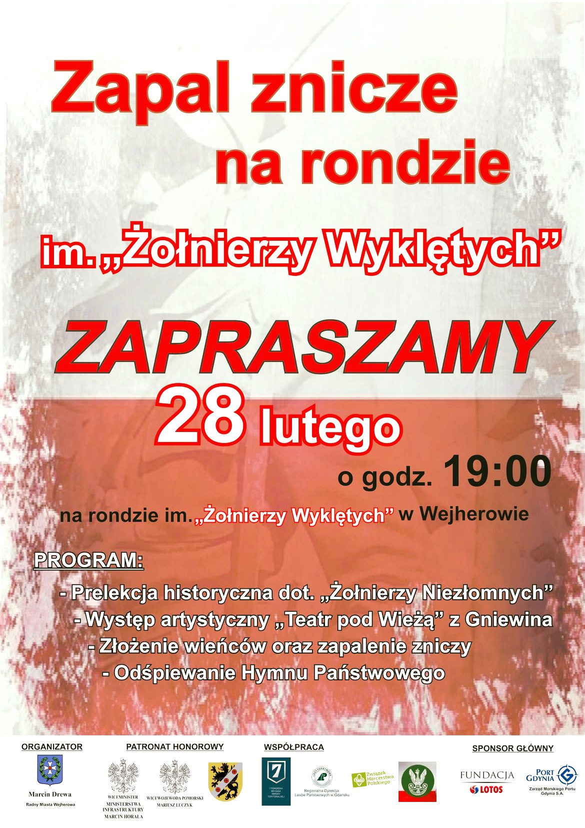 W Wejherowie i wielu innych miejscach w kraju odbywać się będą uroczystości. Pojawią się też znaki pamięci (np. nazwy ulic i rond) po Polakach, w tym Kaszubach, którzy cierpieli na wejherowskiej ziemi z rąk NKWD i UB. To własnie na jednym z takich miejsc uczczą pamieć żołnierzy wyklętych. Wejherowski program wydarzeń przewiduje prelekcję historyczną, występ słowno-muzyczny, składanie kwiatów i zniczy, a także odśpiewanie hymnu państwowego i modlitwę za pomordowanych. Wydarzenie rozpocznie się 28 lutego o godzinie 19:00.
