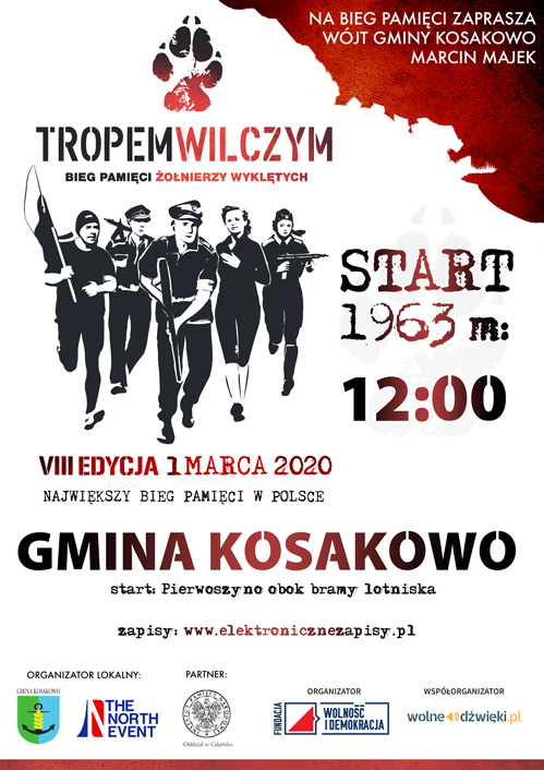 Trzecia edycja Biegu Tropem Wilczym – Biegu Pamięci Żołnierzy Wyklętych na terenie Gminy Kosakowo wystartuje punktualnie o godzinie 12:00. Wydarzenie ma charakter ogólnopolski. Tego dnia, o tej samej godzinie, w kilkuset miejscowościach w kraju oraz w polskich bazach misjach wojskowych tysiące biegaczy pokonają symboliczny dystans 1963 metrów, aby upamiętnić wszystkich Niezłomnych.