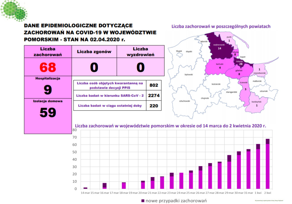 Jak podała w czwartkowy wieczór (stan na godzinę 21:37) Wojewódzka Stacja Sanitarno-Epidemiologiczna w Gdańsku, w województwie pomorskim było dotąd łącznie 68 potwierdzonych przypadków zakażenia wirusem SARS-CoV-2. W izolacji domowej przebywało 59 osób, a dziewięć hospitalizowano.