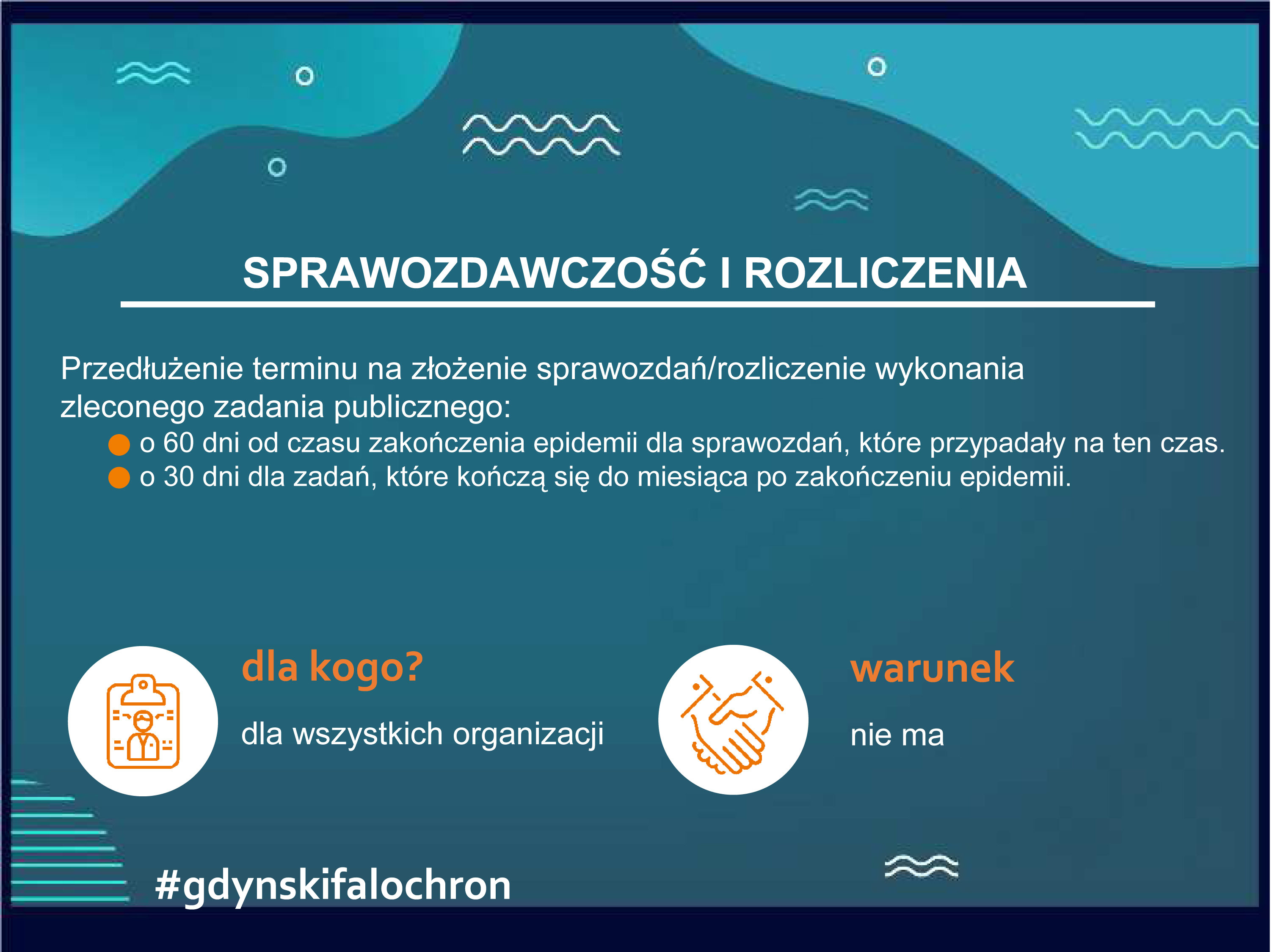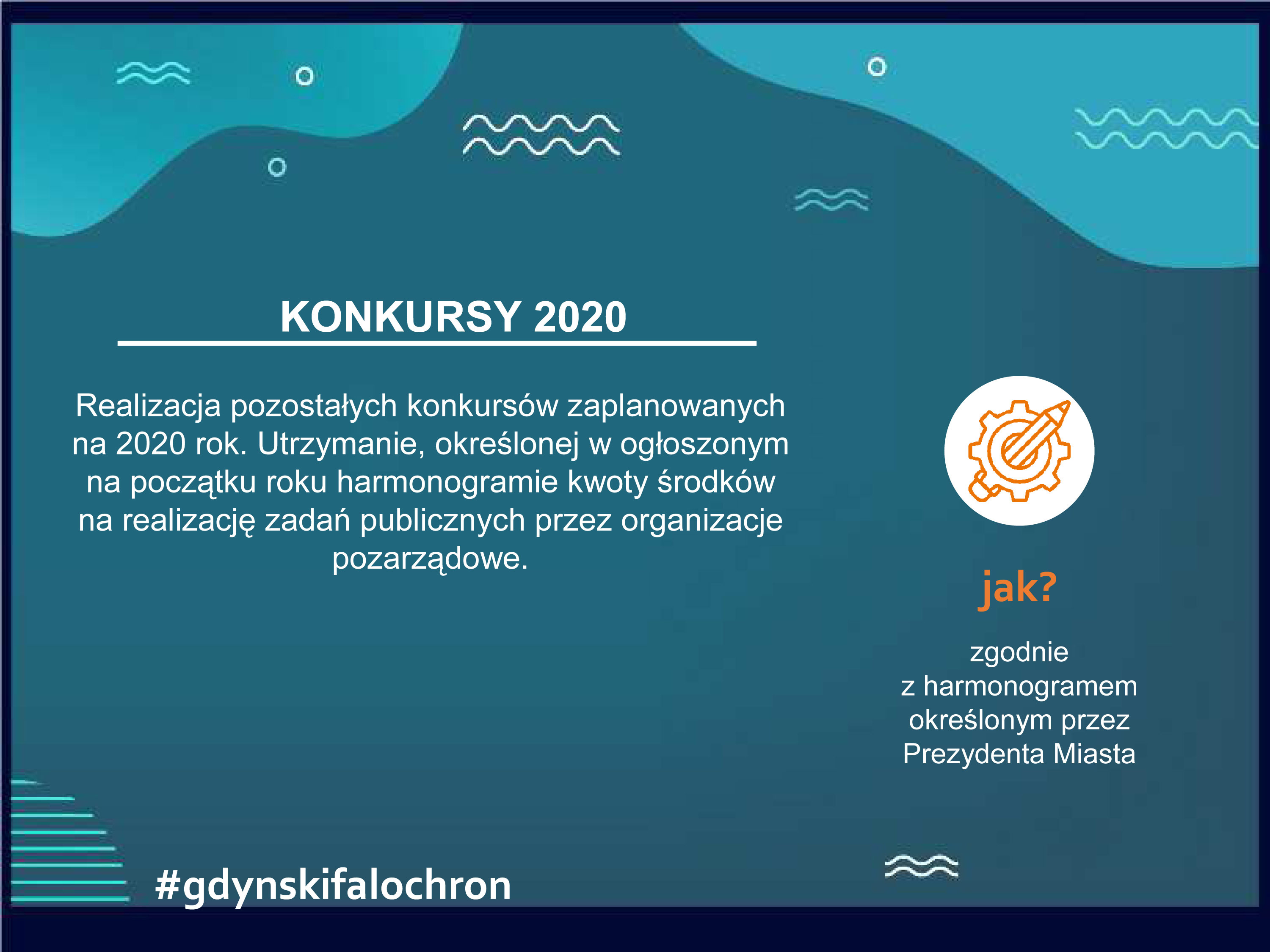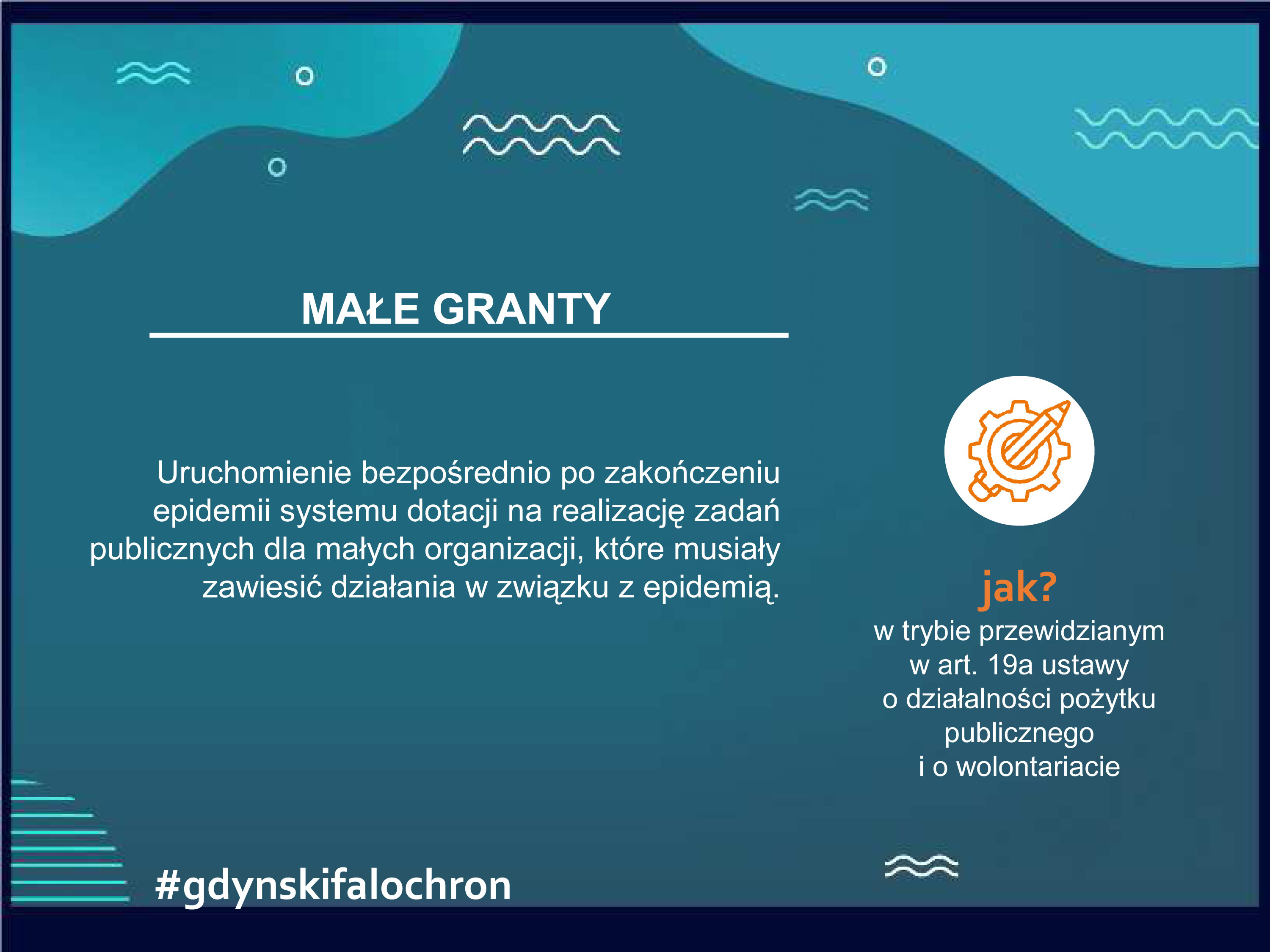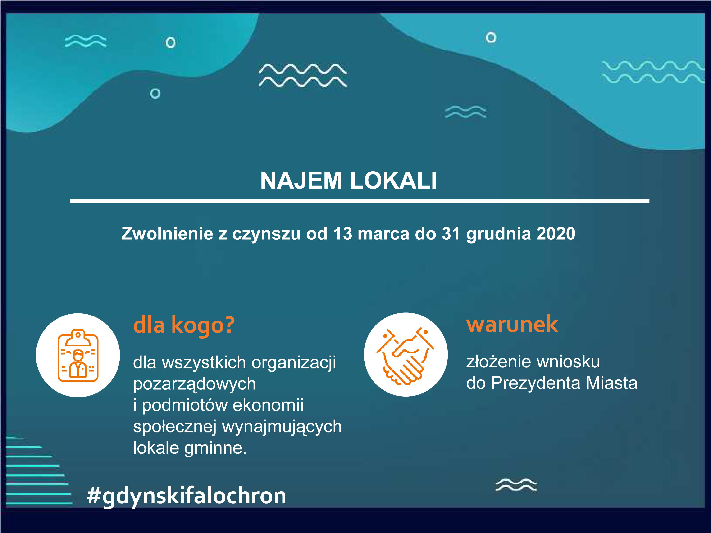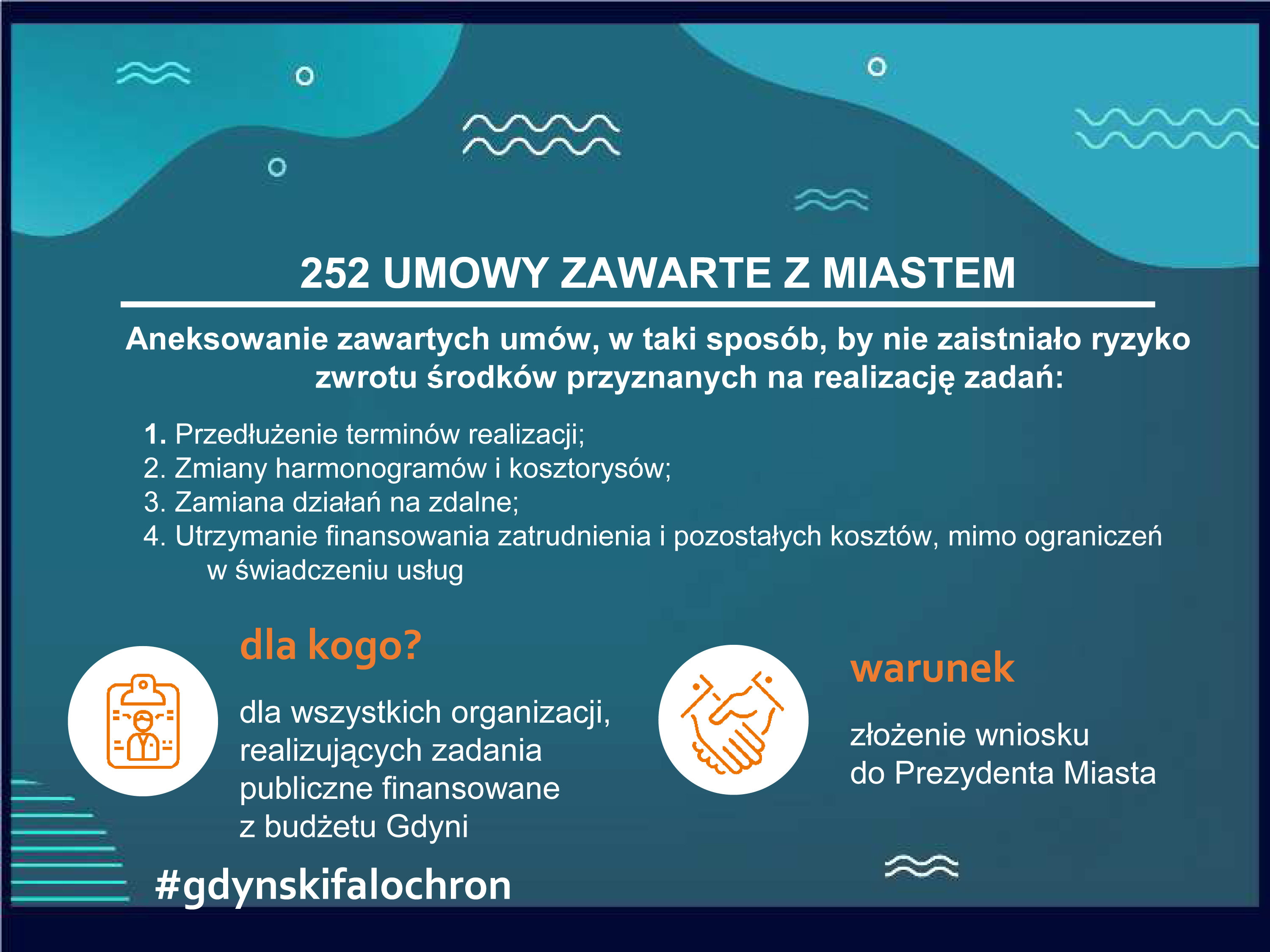 Falochron dla organizacji pozarządowych i podmiotów ekonomii społecznej obejmuje pomoc związaną z realizacją i rozliczeniem już zawartych umów, tak aby organizacje mogły w dalszym ciągu świadczyć pomoc gdynianom, utrzymywać zatrudnienie, a jednocześnie nie miały problemów z rozliczeniem udzielonych im dotacji. Kolejna sprawa to czynsze w lokalach komunalnych, gdzie wszystkie organizacje, które płacą czynsz, mają możliwość wystąpienia z wnioskiem o zwolnienie z płatności w okresie od ogłoszenia stanu epidemii do końca 2020 roku. Zajęto się także sprawą dodatkowych środków na realizację zadań, pożyczek oraz wsparcia doradczego i eksperckiego.