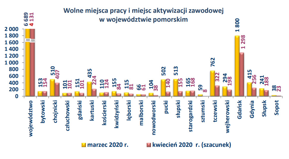 Kilka miesięcy przed wybuchem epidemii COVID-19 rynek pracy na Pomorzu notował same rekordy, m.in. dotyczące małej liczby bezrobotnych, bogactwa ofert zatrudnia i oświadczeń o chęci powierzenia pracy cudzoziemcom. Sytuacja od tego czasu zdążyła się całkowicie zmienić. Z każdym miesiącem pomorscy pracodawcy zgłaszają coraz mniej ofert zatrudnienia. Wstrzymują procesy rekrutacyjne, a nawet rozważają redukcje etatów. W porównaniu z marcem, w kwietniu pracodawcy zgłosili o 2,6 tys. mniej wolnych miejsc pracy, czyli aż o prawie 40 proc.