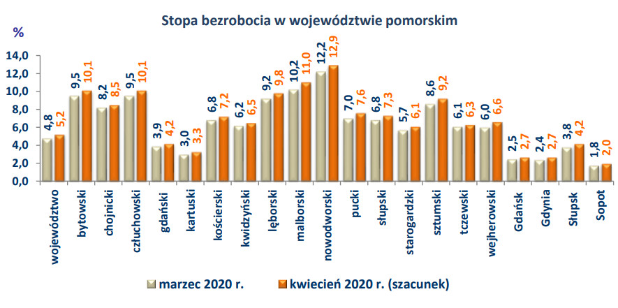Niemal z tygodnia na tydzień rośnie także liczba osób pozostających bez zatrudnienia. W obu wspomnianych powiatach odnotowano wzrost o ponad pół procent. Osoby zarejestrowane w urzędach pracy nie wyrejestrowują się, gdyż brakuje dla nich ofert. W kwietniu wyrejestrowano z pomorskich PUP-ów tylko 2,2 tys. osób bezrobotnych, czyli o prawie 60 proc. mniej niż w marcu (aż o 75 proc. mniej niż w kwietniu 2019 roku). Największy wzrost stopy bezrobocia odnotowano jednak w powiecie nowodworskim (12,9 proc.). Ogółem na koniec kwietnia status osoby bezrobotnej miało 49 tys. mieszkańców Pomorza.
