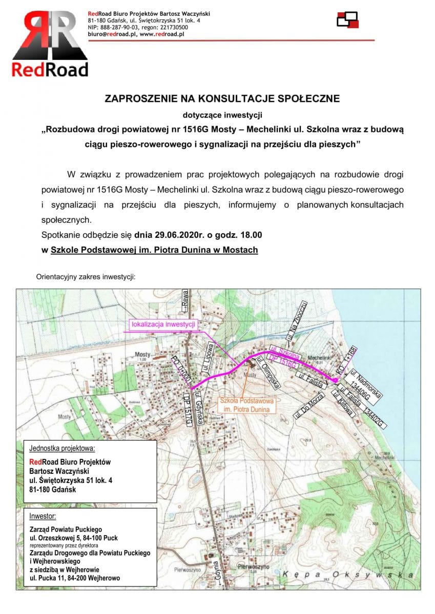 Biuro projektów, działające w imieniu Zarządu Drogowego dla Powiatu Puckiego i Wejherowskiego, wraz z wójtem gminy Kosakowo zapraszają mieszkańców na konsultacje społeczne w sprawie przygotowania inwestycji pn.: „Rozbudowa drogi powiatowej nr 1516G Mosty – Mechelinki ul. Szkolna wraz z budową ciągu pieszo-rowerowego i sygnalizacji na przejściu dla pieszych”.
