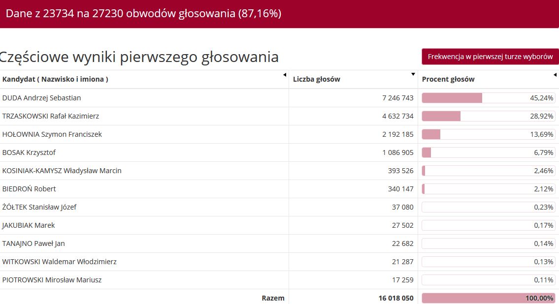 Wiele wskazuje na to, że Andrzej Duda będzie miał jeszcze więcej powodów do zadowolenia. Po zliczeniu głosów z 87,16% wszystkich obwodów głosowania okazuje się, że poparło go łącznie 45,24% wyborców. Drugi na podium Rafał Trzaskowski zyskał 28,92% głosów poparcia, a trzeci Szymon Hołownia – 13,69%.