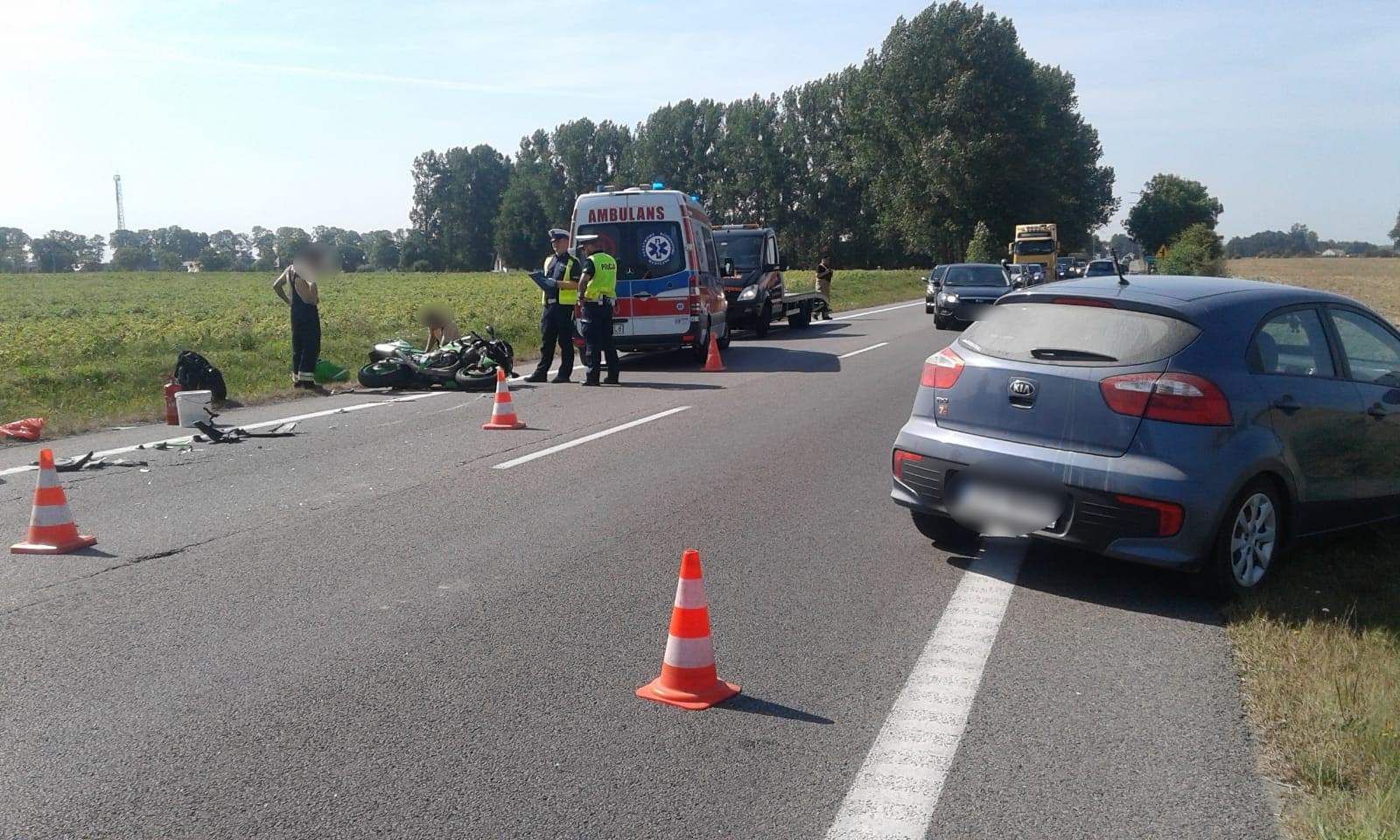 Kierowca jednośladu został przetransportowany do szpitala na badania. Policjanci z uwagi na uszkodzenia pojazdów zatrzymali ich dowody rejestracyjne. Trwa wyjaśnianie dokładnych okoliczności tego zdarzenia.