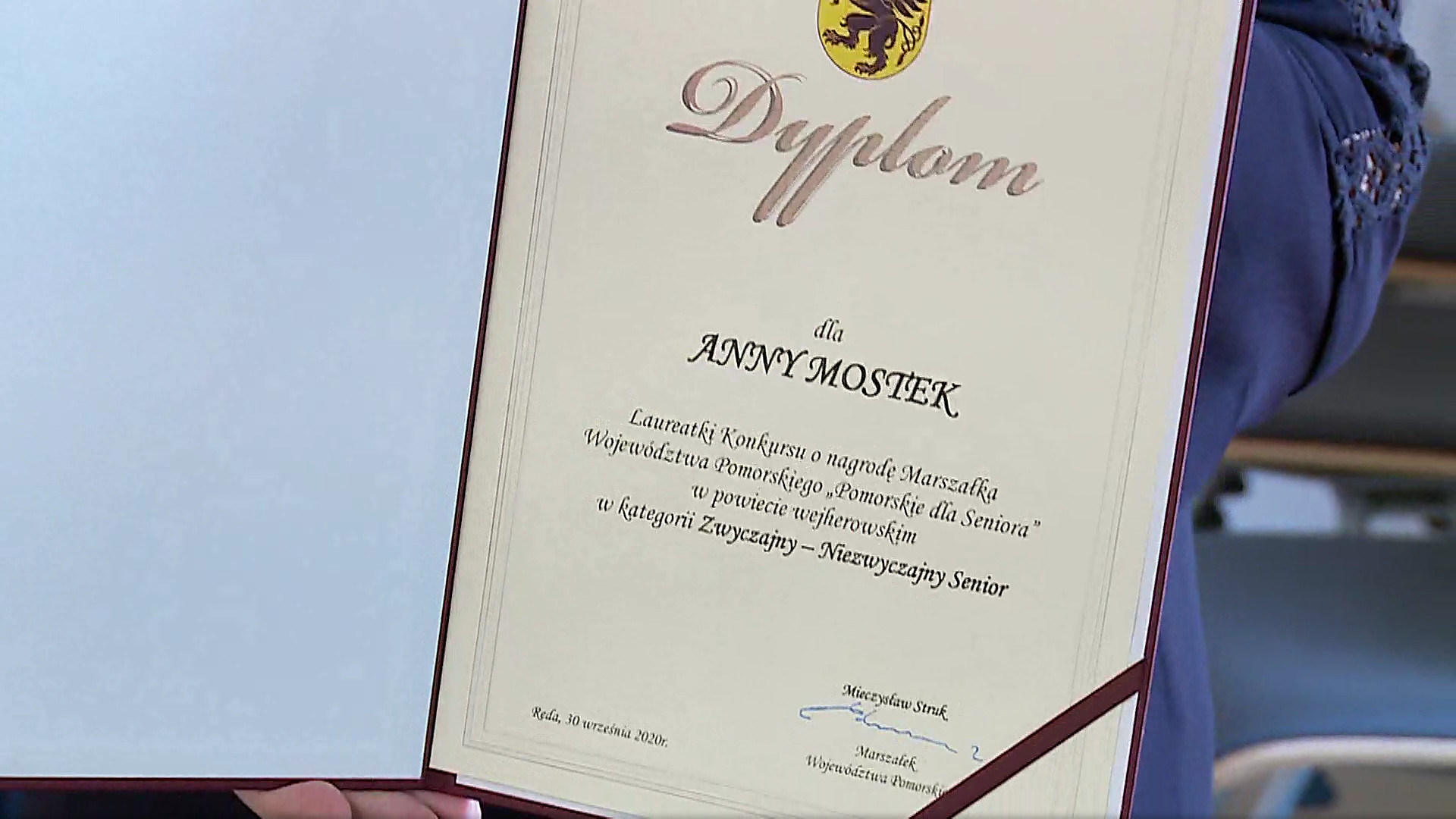 Ostatniego dnia września w Urzędzie Miasta w Redzie odbyła się uroczystość, podczas której pani Annie Mostek wręczony został z rąk wicemarszałka województwa pomorskiego dyplom m.in. za zaangażowanie w życie kulturalne seniorów.
