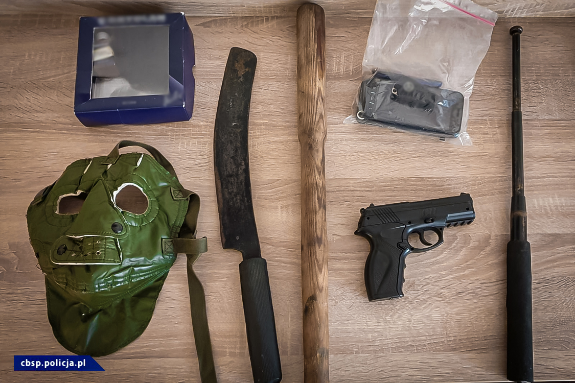Podczas przeszukiwań mieszkań i innych obiektów policjanci zabezpieczyli amunicje do broni ostrej, atrapę broni palnej, maski, kominiarki i niebezpieczne narzędzia w postaci maczety, pałki teleskopowej, kija bejsbolowego czy noży. Zabezpieczono także kilkanaście telefonów komórkowych, zapiski i dokumenty rozliczeniowe i gotówkę.