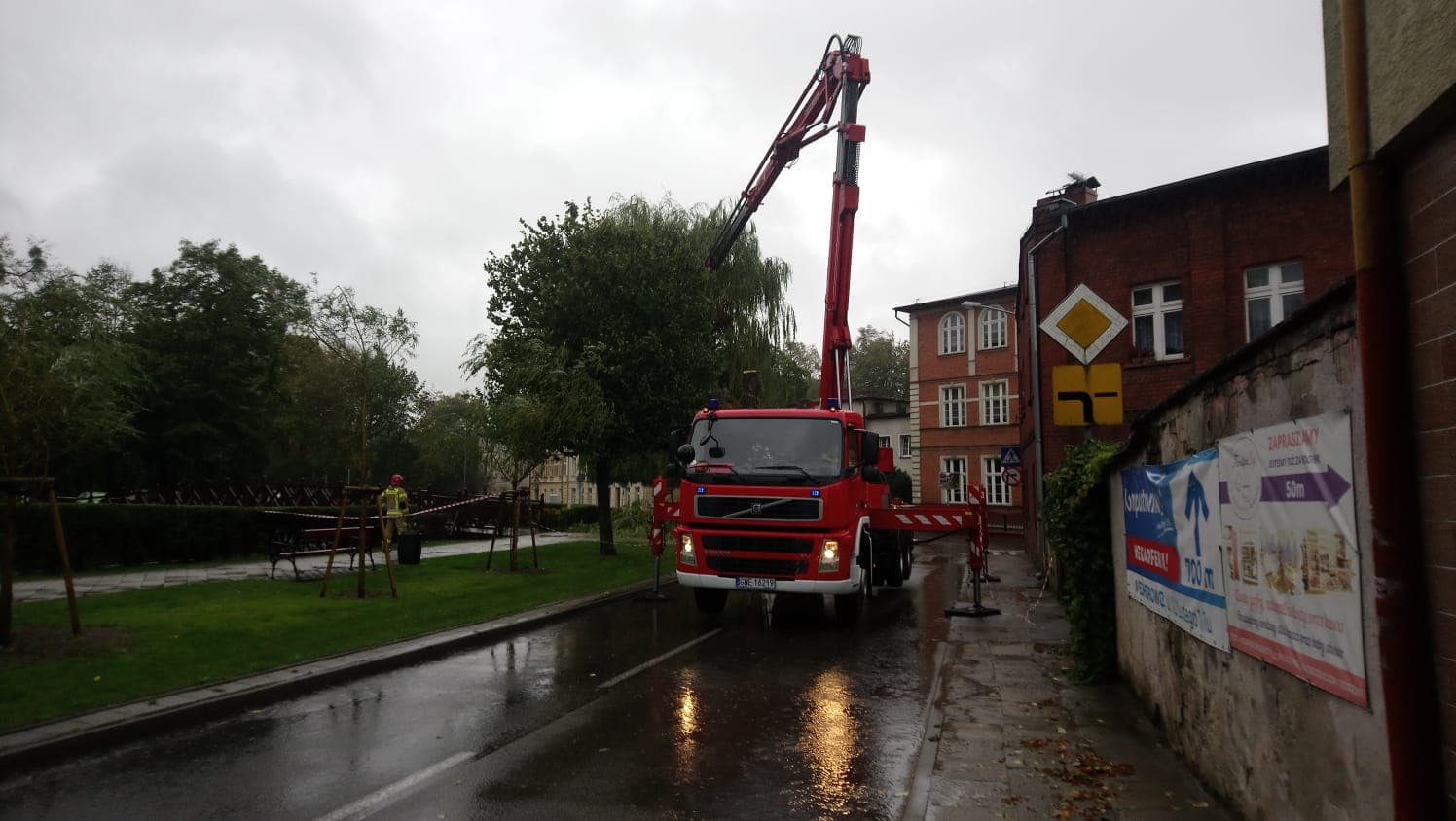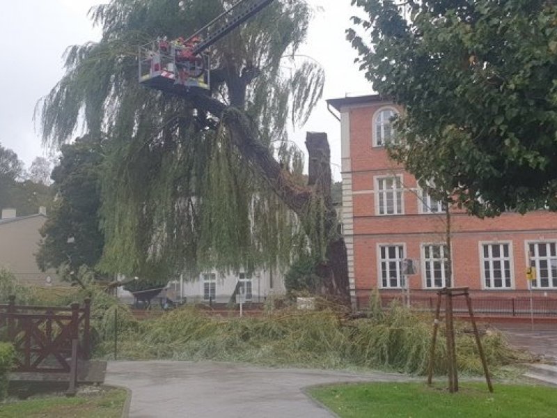 Z rana działania podjęli także strażnicy ze Straży Miejskiej w Wejherowie. O godz. 8:00 otrzymali zgłoszenie, że wierzba płacząca rosnąca w obrębie ulic Św. Jacka i Parkowej ma pęknięty pień. Drzewo stwarzało zagrożenie dla pieszych, budynków oraz przejeżdżających aut.