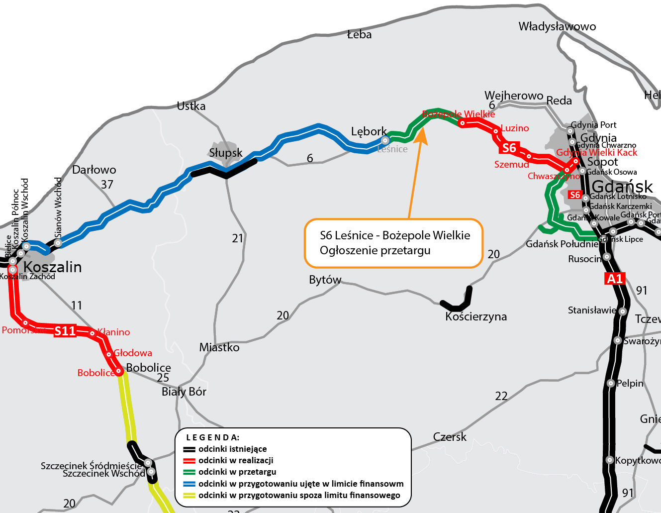 Obecnie w budowie w województwie pomorskim są już trzy odcinki drogi S6 między Bożympolem Wielkim a Gdynią o łącznej długości około 42 kilometrów. Pierwsze samochody powinny tamtędy przejechać pod koniec 2021 r. Natomiast w przetargu jest jeszcze Obwodnica Metropolii Trójmiejskiej: odc. Chwaszczyno – Żukowo (ok. 16, 3 km) oraz Żukowo – Gdańsk Południe (ok. 16 km) wraz z obwodnicą Żukowa (ok. 7 km).