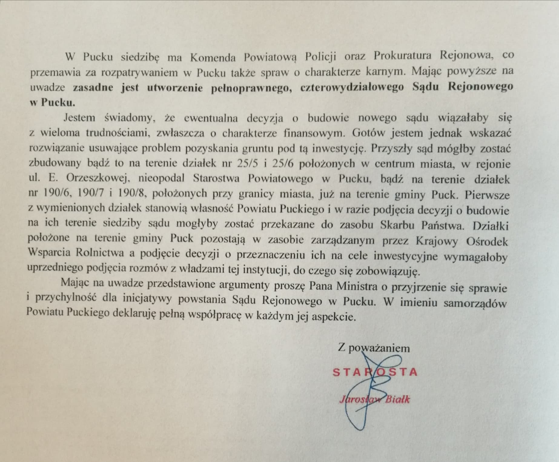Ponadto Jarosław Białk zwrócił uwagę na to, że w Pucku ma swoją siedzibę Komenda Powiatowa Policji i Prokuratura Rejonowa, co przemawia za rozpatrywaniem w mieście także spraw o charakterze karnym.