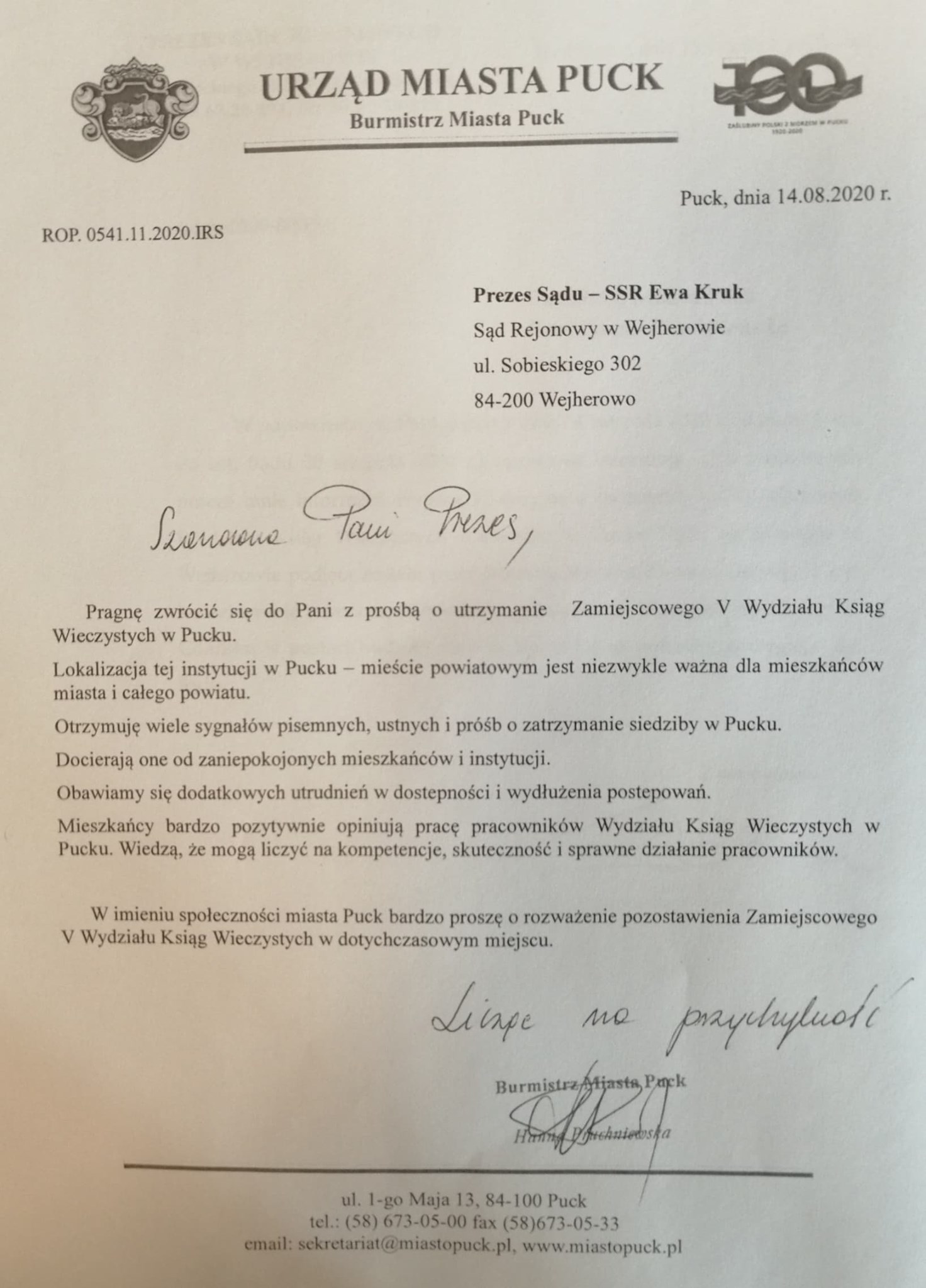 Pragnę zwrócić się do Pani z prośbą o utrzymanie Zamiejscowego V Wydziału Ksiąg Wieczystych w Pucku. Lokalizacja tej instytucji jest niezwykle ważna dla mieszkańców miasta i całego powiatu.[…] Obawiamy się dodatkowych utrudnień w dostępności i wydłużenia postępowań – pisze Hanna Pruchniewska w piśmie do prezes wejherowskiego sądu Ewy Kruk.