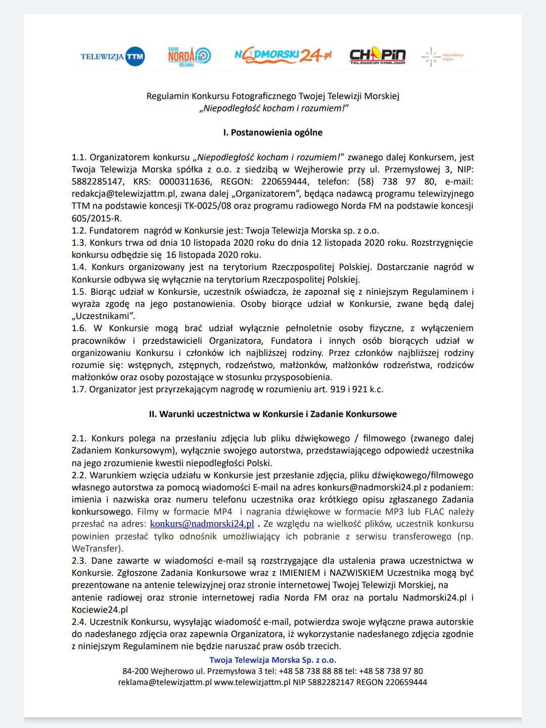 Twoja Telewizja Morska wraz z Partnerami zaprasza do udziału w konkursie o tematyce patriotycznej „Niepodległość kocham i rozumiem!”. To doskonała okazja, by uczcić to ważne święto dla każdego Polaka a przy okazji dobrze się bawić i krzewić wartości patriotyczne. Do wygrania są cenne nagrody.