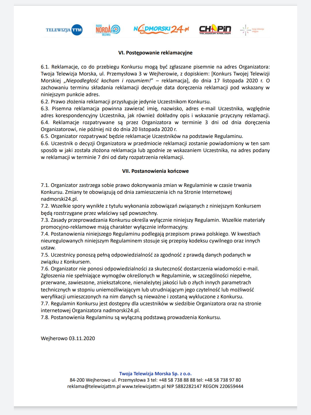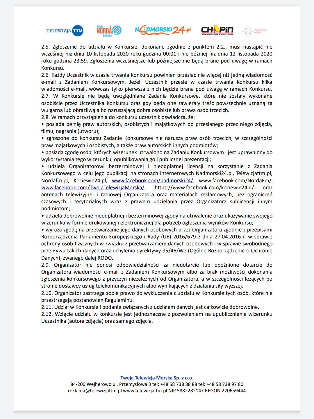 Prace konkursowe można wysyłać od 10 listopada do 12 listopada na adres konkurs@nadmorski24.pl. Na ten adres można też przesyłać odnośniki umożliwiające pobranie filmu czy piosenki zgłaszanej do konkursu, jeżeli ich rozmiar wyklucza przesłanie w formie załącznika do e-mail.