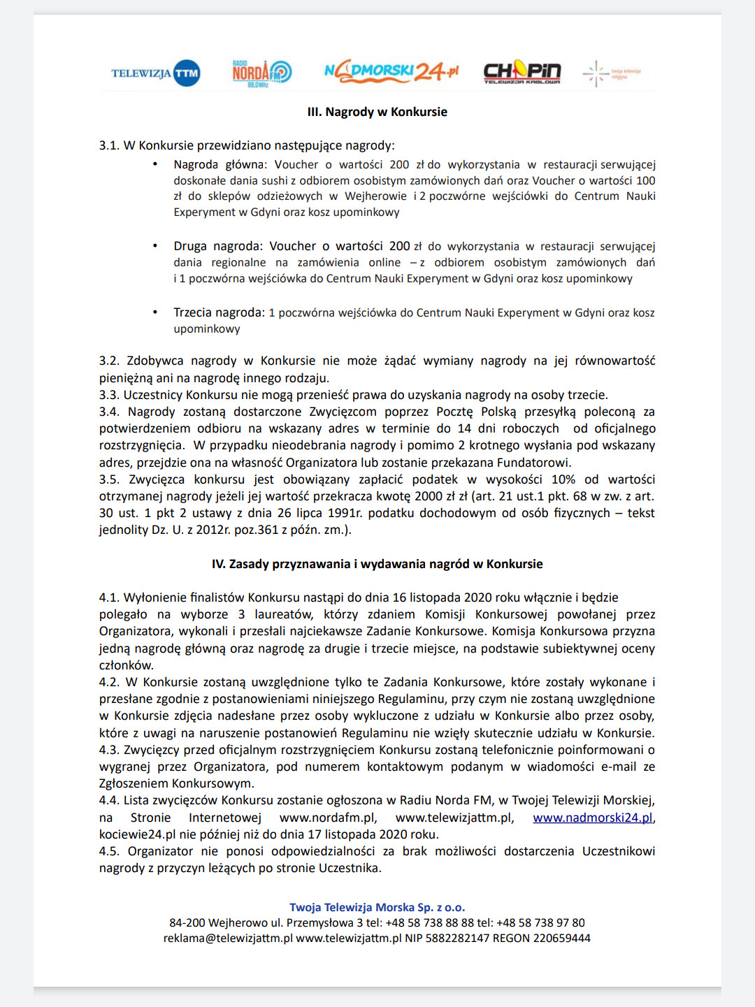 — Nagroda główna: Voucher o wartości 200 zł do wykorzystania w restauracji serwującej doskonałe dania sushi z odbiorem osobistym zamówionych dań oraz Voucher o wartości 100 zł do sklepów odzieżowych w Wejherowie i 2 poczwórne wejściówki do Centrum Nauki Experyment w Gdyni oraz kosz upominkowy.