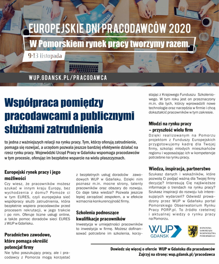 W poniedziałek (9 listopada) rozpoczęły się Europejskie Dni Pracodawców, które potrwają do 13 listopada. Jest to coroczne wydarzenie organizowane przez Publiczne Służby Zatrudnienia w Unii Europejskiej. Wojewódzki Urząd Pracy w Gdańsku przygotował kampanię, w której informuje o tym, z jakich programów i projektów mogą korzystać pomorscy pracodawcy.