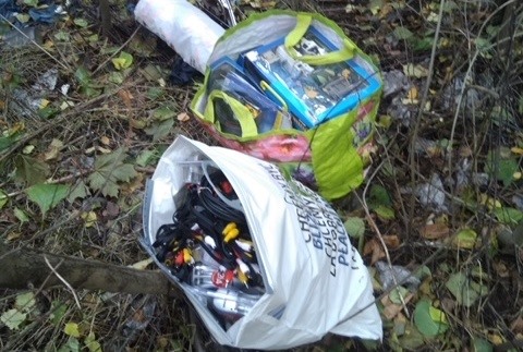 Przewodnik psa zauważył tam dwie torby podróżne i dwie torby budowlane z zabawkami i sprzętem elektronicznym, elektronarzędziami i kompletami kluczy nasadowych niewiadomego pochodzenia.