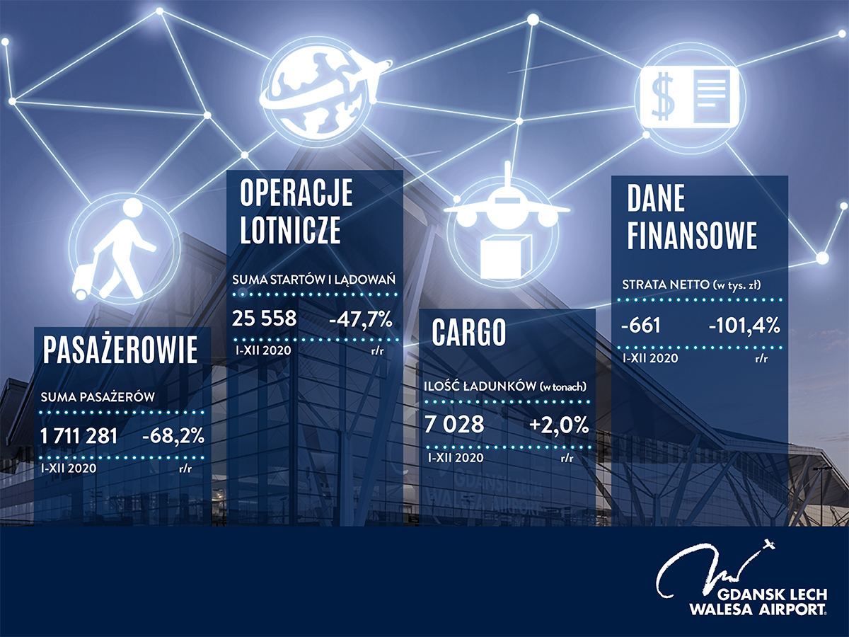 W 2020 roku z usług gdańskiego lotniska skorzystało ponad 1,7 miliona pasażerów. Jest to bardzo dobry wynik jak na czas pandemii. Ostatni raz z portu lotniczego skorzystało tak mało osób w 2007 roku. Wzrósł także ruch cargo, a realizacja najważniejszych inwestycji przebiegała bez zakłóceń.