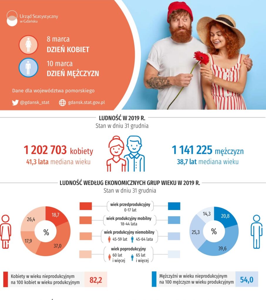 W 2019 roku w województwie pomorskim mieszkało ponad 2,3 mln ludzi – dokładnie 1 202 703 kobiet i 1 141 225 mężczyzn. Przeciętna mieszkanka Pomorza ma 41,3 lata, a dla porównania mężczyzna jest od niej o 3 lata młodszy (38,7). W Pomorskie żyje 37 proc. kobiet w wieku produkcyjnym mobilnym (18-44 lata). Mężczyzn, jak czytamy na pomorskie.eu, jest w tej grupie prawie 40 proc.