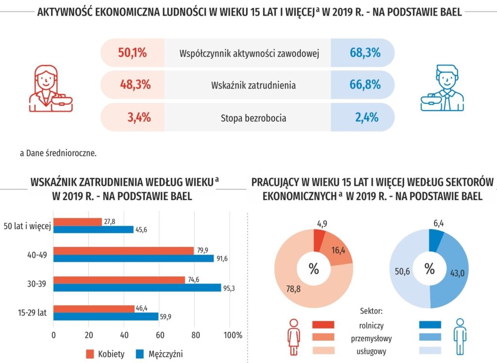 Studia wyższe ukończyło 29 proc. pań, co daje o ponad 5 proc. więcej niż panów. Co ciekawe, wykształceniem policealnym i średnim zawodowym może pochwalić się niemal tyle samo kobiet (22,8 proc.), co mężczyzn (22,5 proc.). Więcej pań (14,3 proc.) niż panów (9,1 proc.) ma wykształcenie średnie ogólnokształcące. U mężczyzn dominującym jest wykształcenie zasadnicze zawodowe – ma je ponad 30 proc. w porównaniu z ponad 17 proc. kobiet.