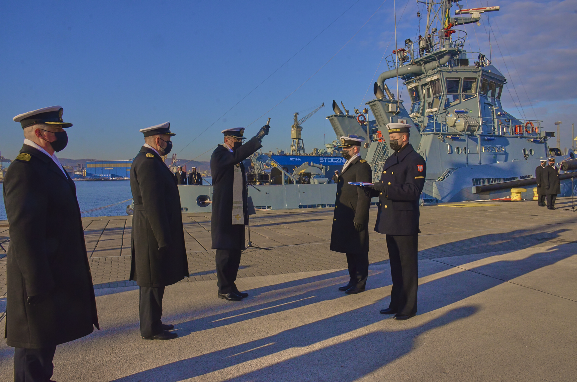 W uroczystości wzięli udział także konstruktorzy jednostki, przedstawiciele stoczni Remontowa Shipbuilding i matka chrzestna nowego holownika – mgr. Inż. Hanna Szkodo, dyrektor Zespołu Szkół Morskich im. Bohaterskich Obrońców Westerplatte w Gdańsku.