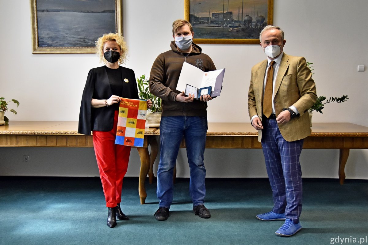 Pan Łukasz Urbanowicz oprócz medalu otrzymał pamiątkowy dyplom i gdyńskie upominki.