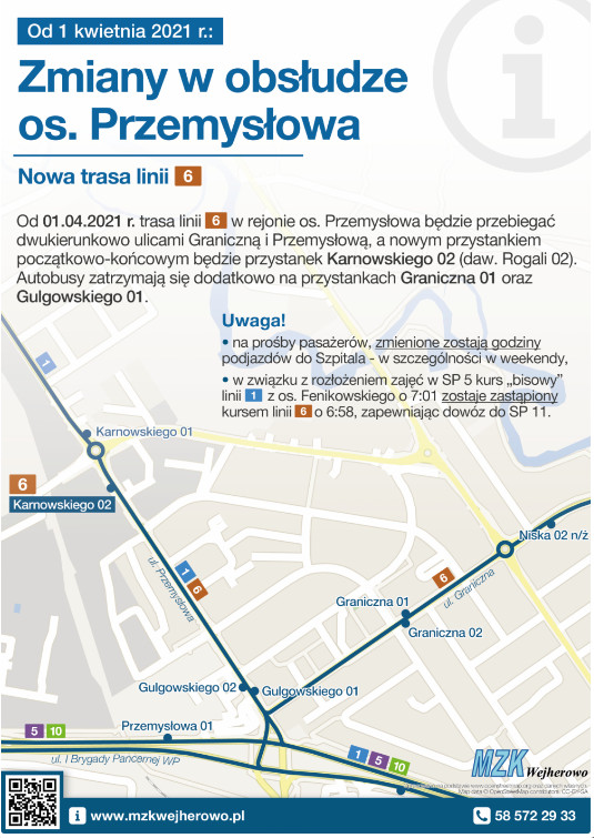 Miejski Zakład Komunikacji w Wejherowie poinformował o zmianie na stałe trasy linii autobusowej nr 6. Autobus będzie rozpoczynał oraz kończył kurs na przystanku Karnowskiego 02. Nowy rozkład jazdy będzie obowiązywał od czwartku (1 kwietnia).
