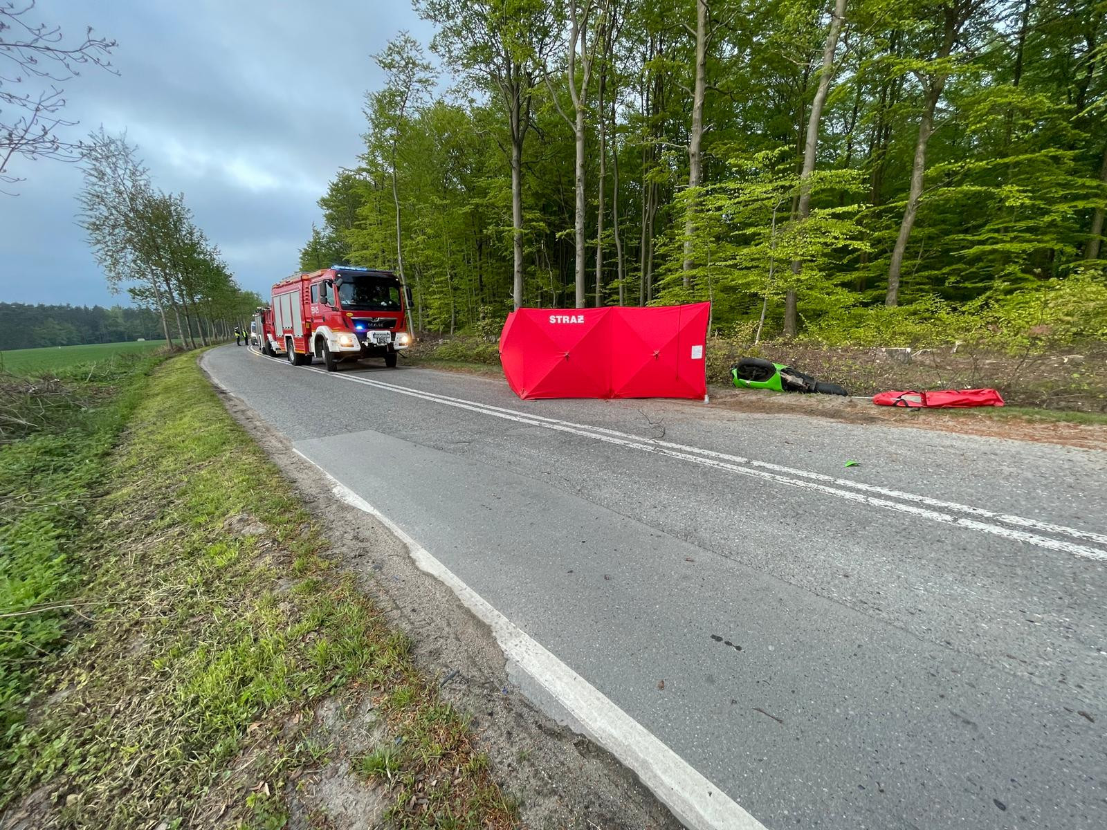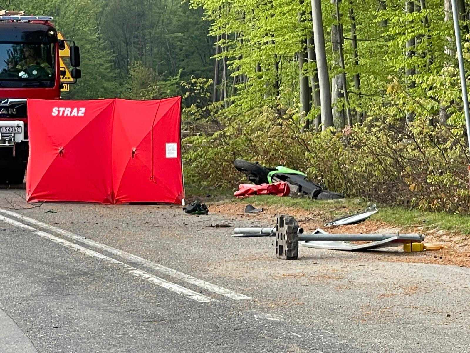 Z niewiadomych przyczyn kierowca motocykla zjechał z drogi i uderzył w znak drogowy. Służby medyczne podjęły reanimacje, ale nie udało się przywrócić czynności życiowych poszkodowanego.