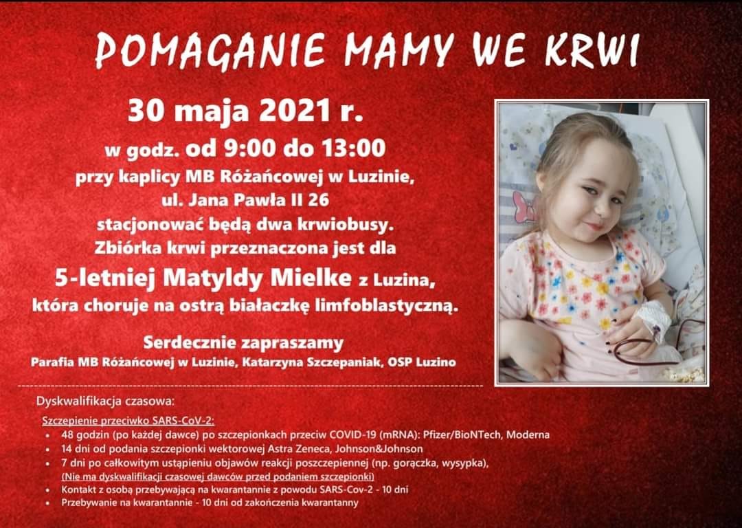 Jak podaje luziński urząd gminy, osoby, które nie mogą pojawić się na zbiórce mogą oddać krew w punkcie krwiodawstwa z dedykacją dla Matyldy Mielke, Uniwersyteckie Centrum Kliniczne, oddział Hematologii Dziecięcej, ul, Dębinki 7, 80-952 Gdańsk.